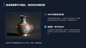 基于双路采集架构与可变视场设计,实现从微小精密件到大尺寸物体的统一扫描;叠加4800万像素RGB采集,输出兼具几何精度与真实纹理的高质量数字模型。